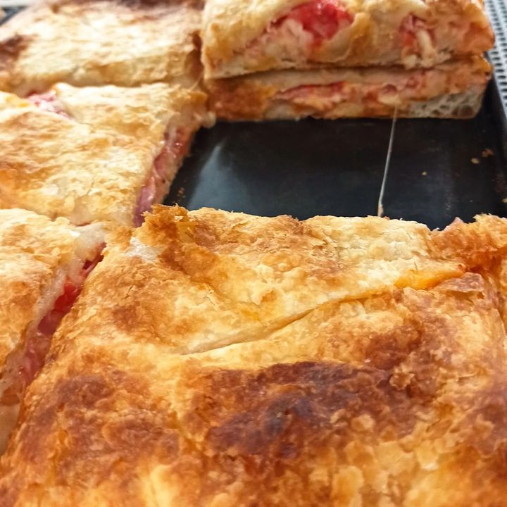 Pizza baciata: così chiamata poichè si prepara cuocendo 2 impasti, appoggiati uno sopra l'altro che rimangono separabili grazie ad una generosa spennellata d'olio sulla superficie.
