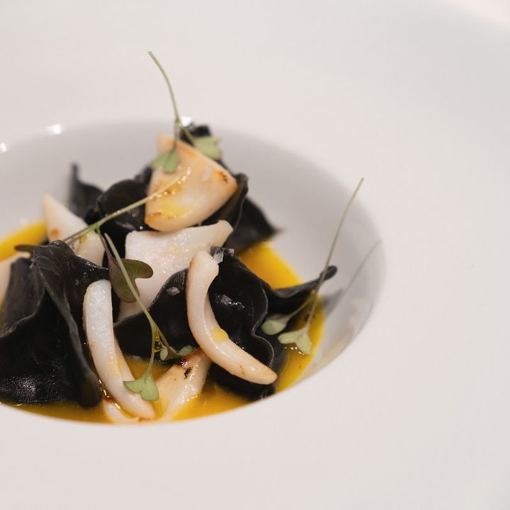 Ecco i “Fazzoletti di seppia e il suo nero con salsa di calamari e zafferano” del nostro Antonio Sgarra